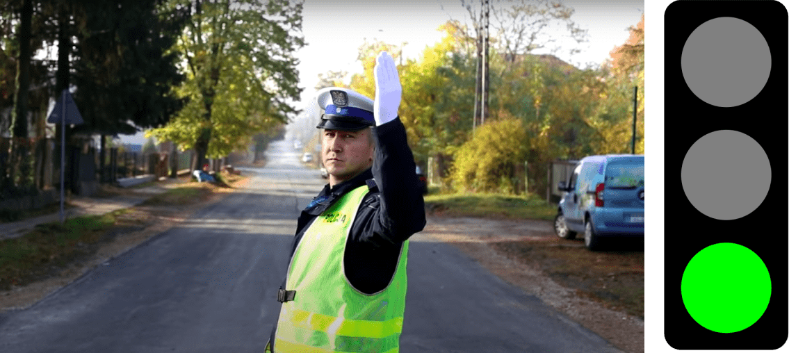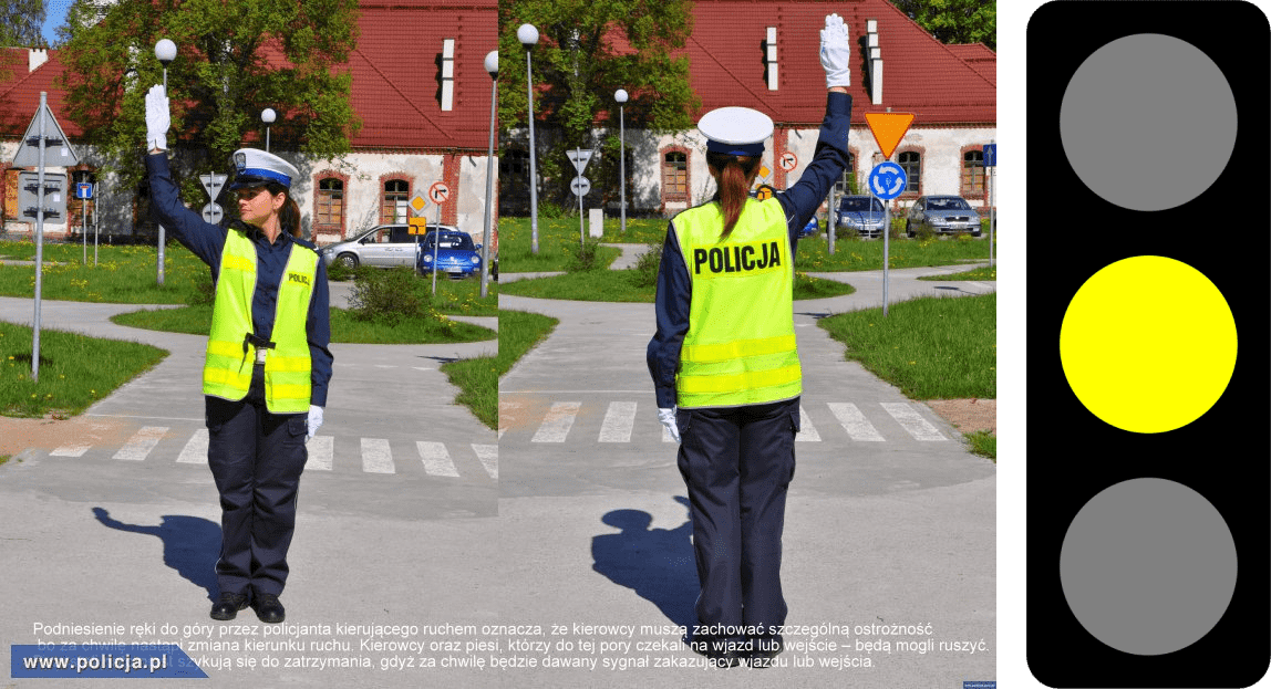 żółtego sygnału. Policjant z jedną podniesioną ręką to dla kierowców znak, że powinni zachować