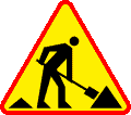 5. Znak A-14 „roboty na drodze” ostrzega o prowadzonych na drodze robotach; umieszczona pod znakiem tabliczka T-19 wskazuje na malowanie znaków poziomych.