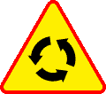 8. Znak A-8 „skrzyżowanie o ruchu okrężnym” ostrzega o skrzyżowaniu, na którym ruch odbywa się dookoła wyspy lub placu w kierunku wskazanym na znaku.